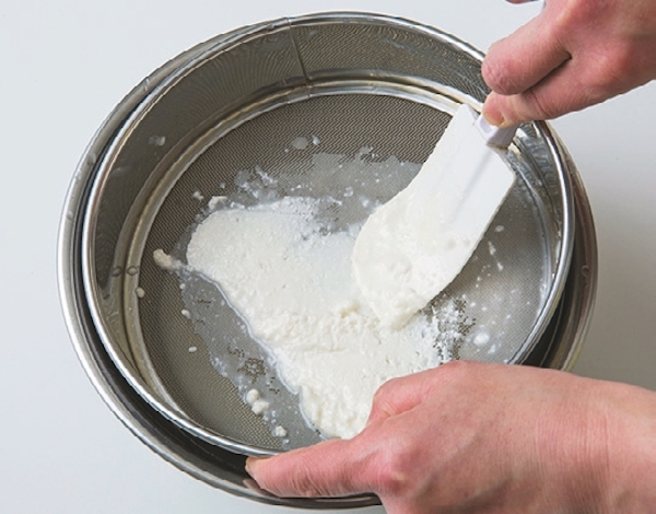 1を裏ごしし、裏ごし器に生地が残ったら、ゴムべらでしごいてこし入れる。