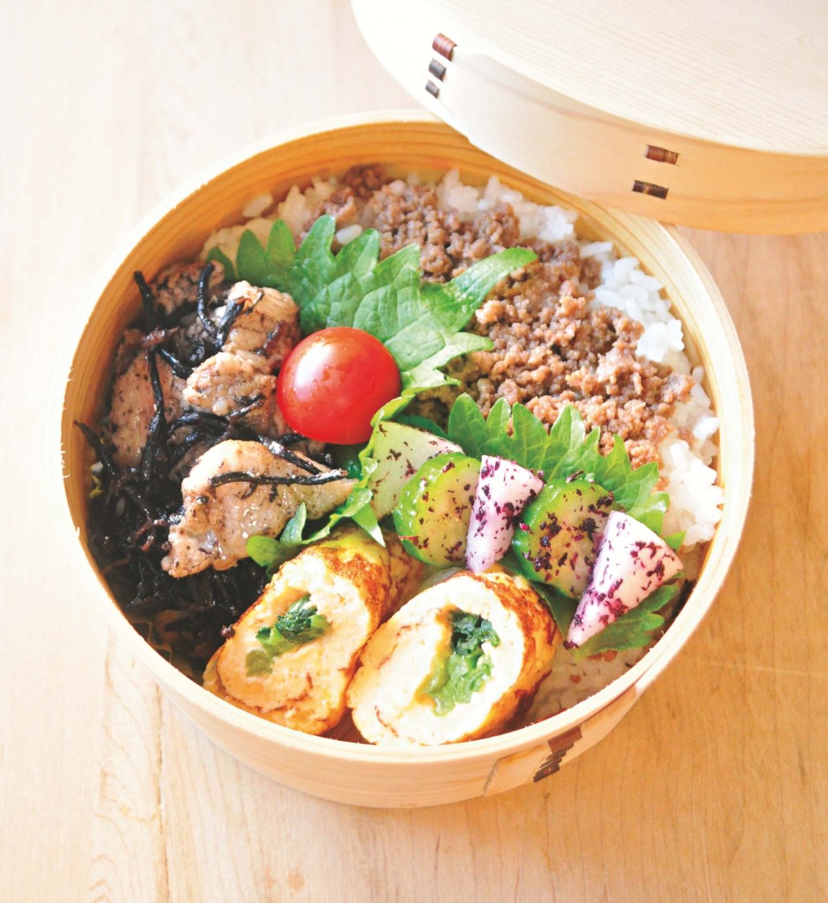 簡単に作れて見栄えがよく、何度食べても飽きがこない、ボリューム満点のお弁当レシピをご紹介します。今回は「豚ひじき弁当」をお届け。豚バラ肉は歯ごたえのよい長ひじきといっしょに中華風の炒めものに。作り置きのレンジ小松菜は卵で巻き、彩りをアップ。きゅうりは大根といっしょにゆかりであえて箸休めにしました。ご飯には常備菜で作った肉そぼろを散らしています。