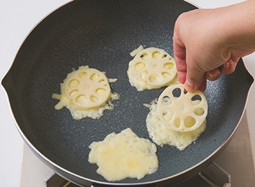 2.下記の「ポイント」の要領で、フライパンにチーズをのせて弱めの中火にかけ、れんこんをのせて裏返す。弱めの中火でれんこんに火が通るまで2~3分焼く。