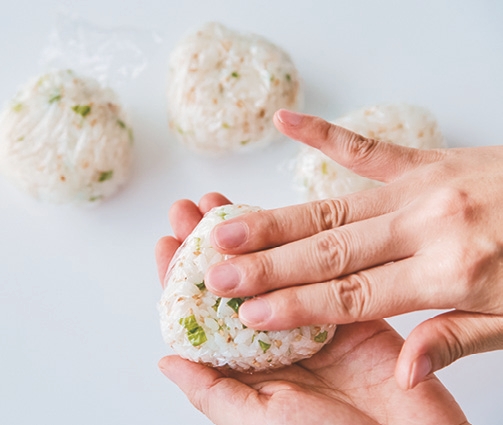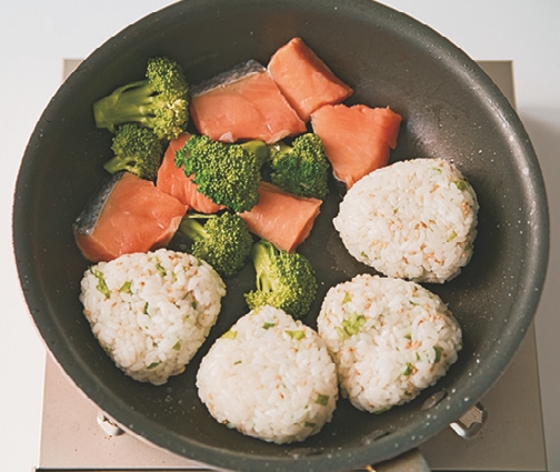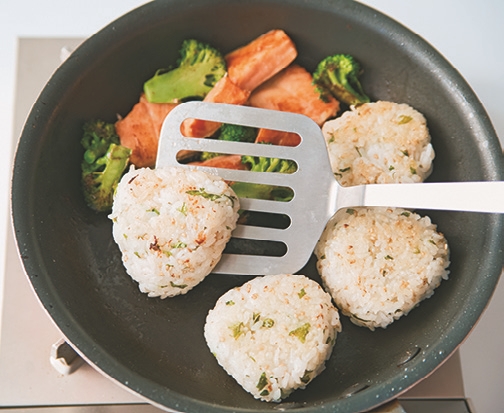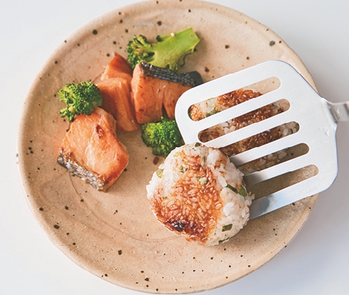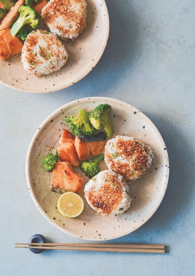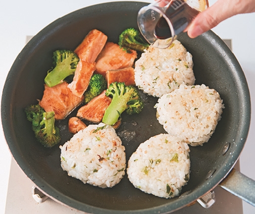 そこで今回は、「香味焼きおにぎり、さけプレート」を紹介。おにぎりはこんがりと焼いて特別感をアップ! ご飯に青じそとごまを混ぜ、風味よく仕上げます。大きなフライパンでさけ、ブロッコリーもいっしょに焼けば、あっという間に完成です。