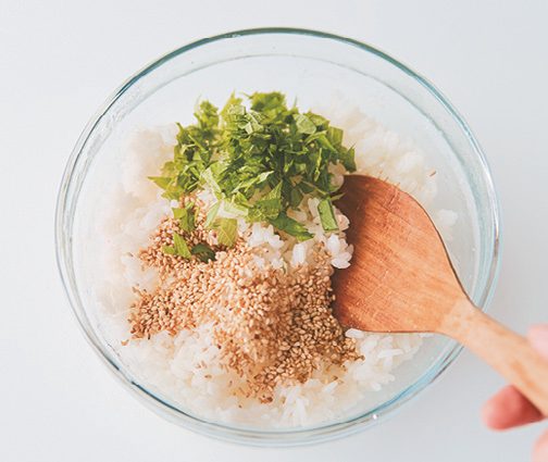 青じそは粗めのみじん切りにし、ごま、塩とともにご飯に混ぜる。