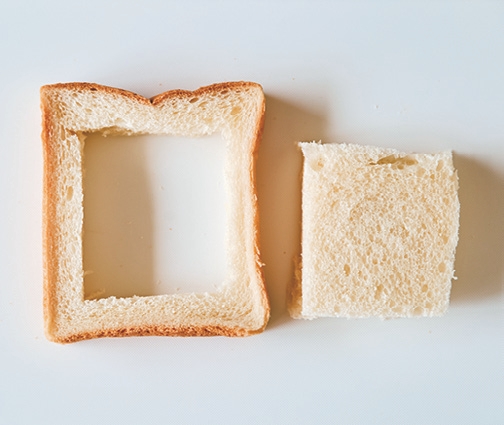 2.食パンは写真のようにまわりを2cmほど残し、真ん中を包丁で四角く切り取る。