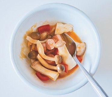 1.エリンギは食べやすい大きさに、ソーセージは1cm幅に切る。パプリカは1.5cm角の角切りにし、しめじはほぐす。【A】をボウルに入れ、スプーンで混ぜ合わせる。