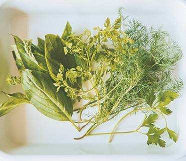 左からバジル、チャービル、ディル、イタリアンパセリ。スプラウトの代わりに好みのハーブを使っても。