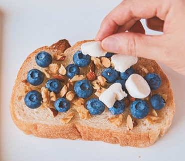 1.パンにブルーベリー、刻んだナッツ、ちぎったマシュマロをのせ、もう1枚のパンではさむ。