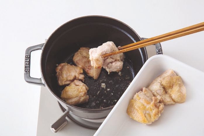 2.鍋にサラダ油を熱し、鶏肉を入れて表面の色が変わるまで弱めの中火で焼き、バットに取り出す。
