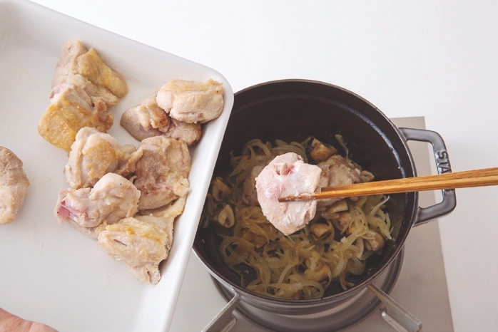 白く仕上げたいため、鶏肉には焼き色をつけず、白っぽくなったら取り出す。玉ねぎとマッシュルームを炒めてうま味を引き出してから、肉を戻して煮込む。
