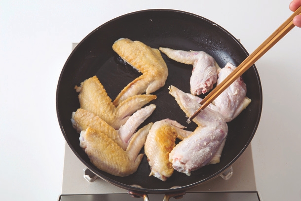 手羽先が並べられるような大きめのフライパンが便利。ここでは直径26cmほどのものを使用。