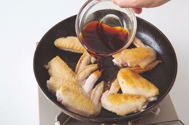 たれは合わせておき、一度に加えて手羽先にからめる。