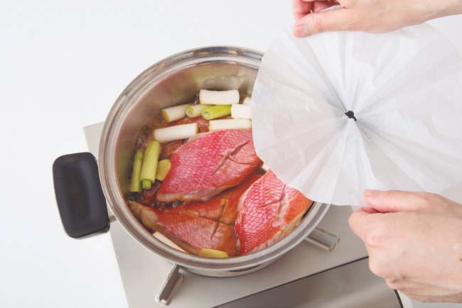 落としぶたをして煮汁を全体にゆき渡らせる。落としぶたはクッキングペーパーを切ったものでOK。