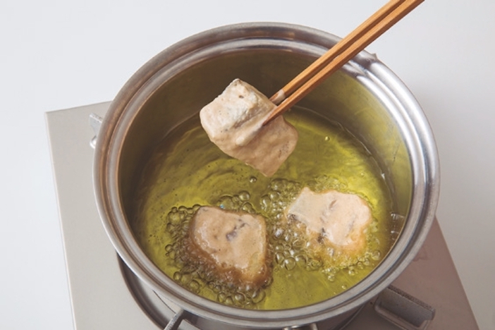 揚げ油は、オリーブ油がない場合はサラダ油でもOK。量は鍋の深さ2cmほどが目安。両面を揚げる。