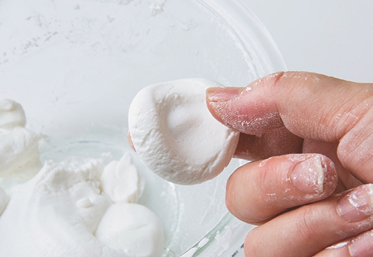 3.白玉団子を作る。ボウルに白玉粉を入れて水を少しずつ加え、そのつど指で水をなじませて練り混ぜる。耳たぶくらいの柔らかさになるまで水を加えて調節する。