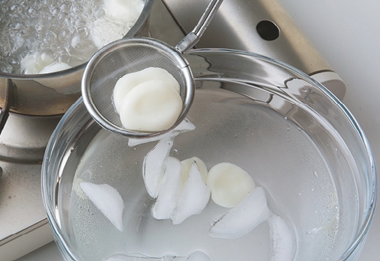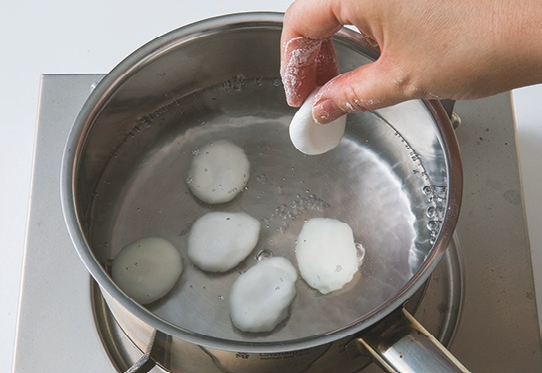 4.鍋にたっぷりの水(分量外)を沸かし、塩一つまみ(分量外)を加える。3を12等分して手で丸め、少し平らにして真ん中をくぼませ、湯に入れる。浮き上がってきたら1分ほどゆでる。