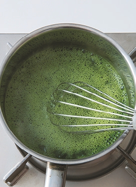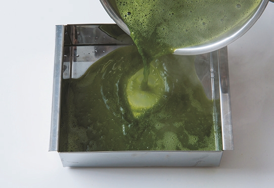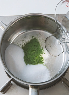 1.抹茶寒天を作る。鍋にふるった抹茶、グラニュー糖、粉寒天を入れ、水を加えて泡立て器で混ぜる。火にかけて沸騰させ、弱火にして混ぜながら2分ほど加熱する。