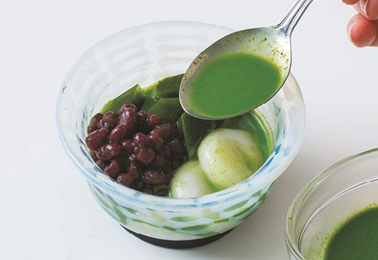 6.2の抹茶寒天を食べやすい大きさに切り、白玉団子、ゆであずきとともに器に盛る。抹茶ミルクを混ぜてから注いでいただく。