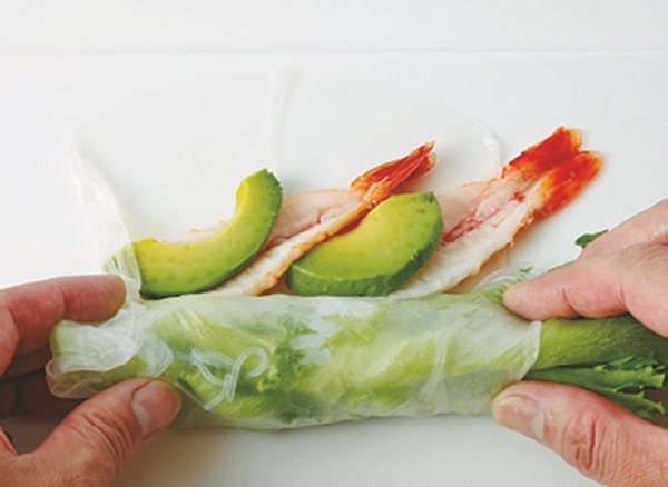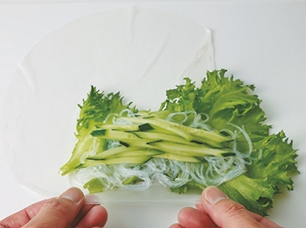 ライスペーパーの右端を折り、葉野菜の葉先を右にしてのせ、春雨、きゅうりを順にのせてきつめにひと巻きする。ライスペーパーの左側を折って巻き、えびとアボカドを交互に置いて巻き上げる。