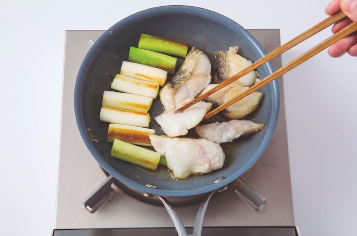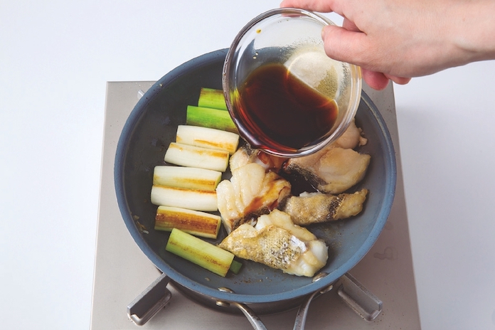 フライパンにごま油を熱し、たらを皮目から入れ、長ねぎを加えて中火で焼き色がつくまで焼く。