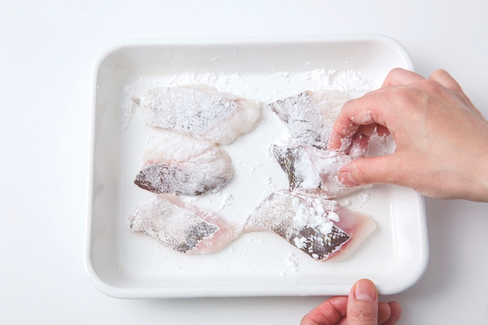 たらは3~4等分に切り、両面に塩、こしょうをふって全体に片栗粉をまぶす。