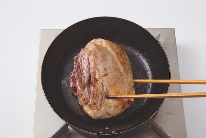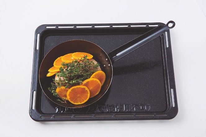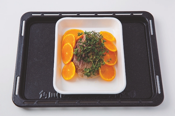 耐熱性のフライパンの代わりに、ホーローなどの耐熱性バットを使って焼くこともできる。作り方2で肉を焼いたあと、フライパンからバットに肉を肉汁ごと移し、オレンジ、タイムをのせて同様に仕上げる。