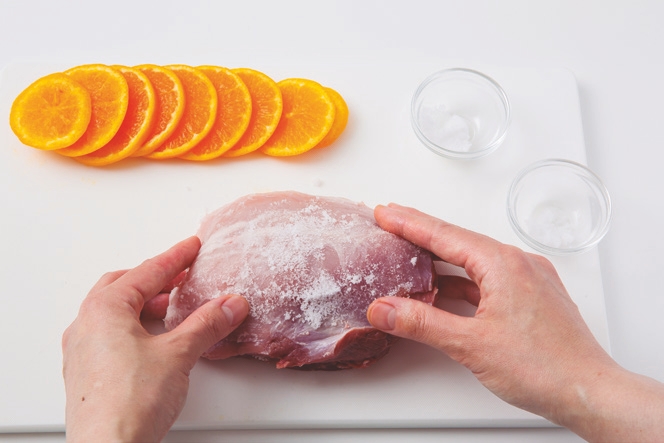 オレンジはよく洗って水気をふき、約5mm厚さの輪切りにする。豚肉は表面に塩、砂糖をまぶす。