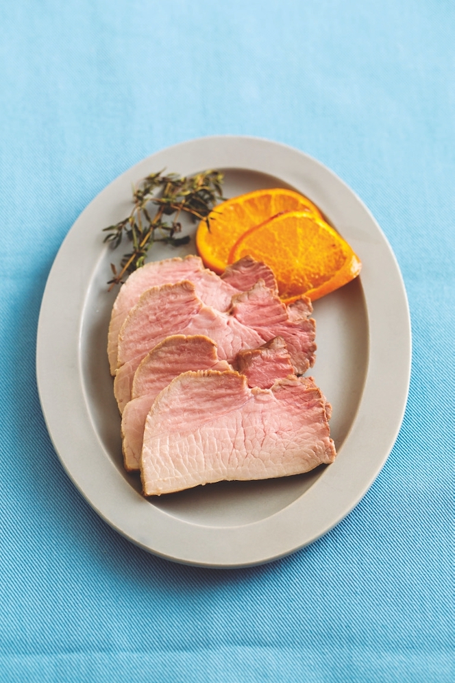 ハーブとオレンジの風味が移ったローストポークを好みの厚さにカットし、オレンジ、タイムを添える。ピンク色の断面が食欲をそそる。