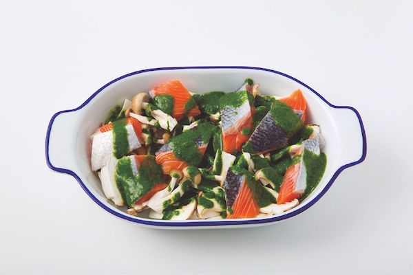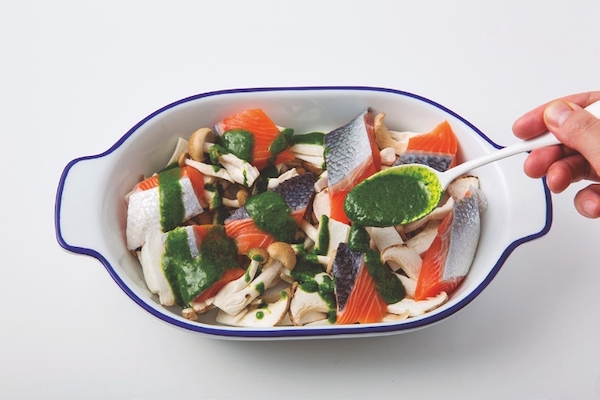 バジルの香りが食欲そそる「サーモンときのこのジェノベーゼグリル」レシピ・作り方