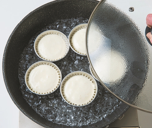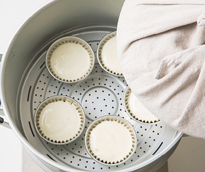 1.蒸し器に水を入れて火にかけ、沸騰したら1を並べる。水滴が落ちないように布ふきん巾で包んでふたをし(画像を参照)、強火で約10分蒸す。取り出して型からはずし、冷ます。