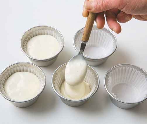 グラシンカップを敷いた型に2をスプーンで等分に流し入れる。