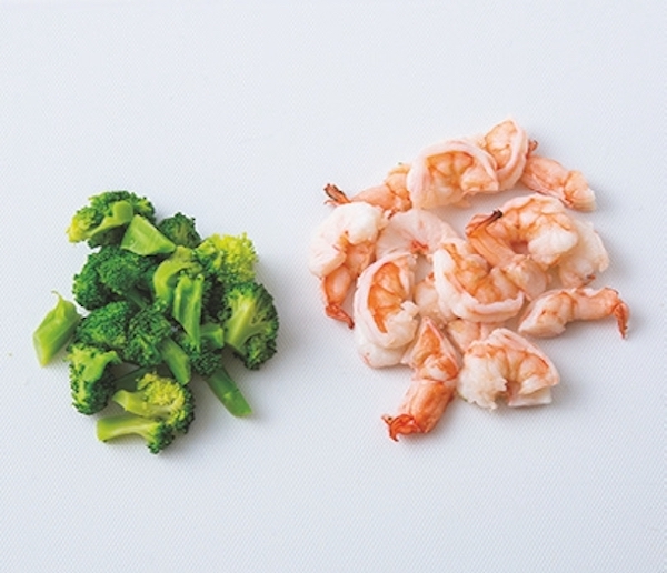 えびは2等分くらいに切り、太い腹のほうは厚みを半分に切る。ブロッコリーも同じくらいの大きさにカット。どちらも食感が楽しめる程度の大きさにする。