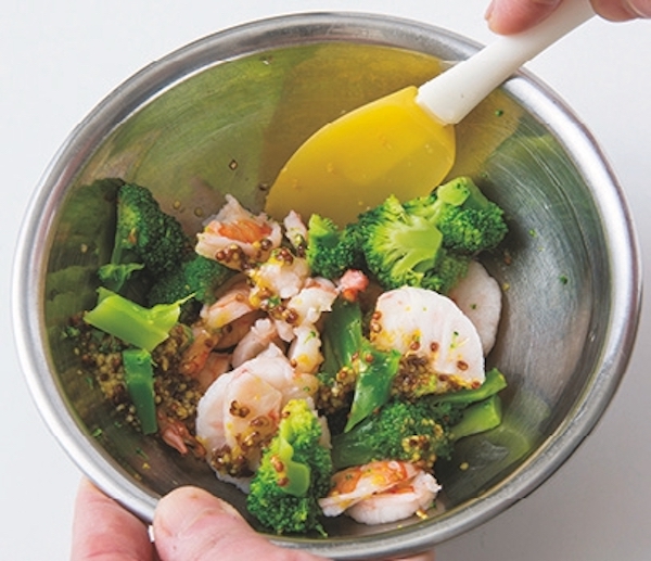 1.えびとブロッコリーはそれぞれゆで、下の写真のように食べやすい大きさに切る。はちみつ、粒マスタード、塩、こしょうであえる。