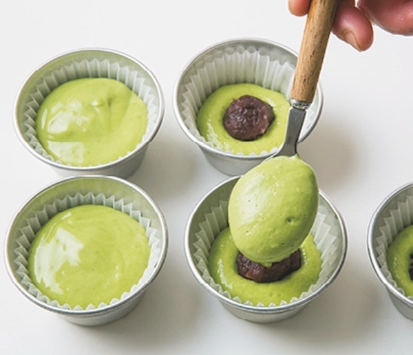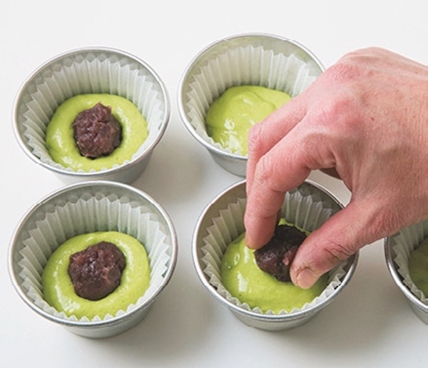 型にほろ苦い抹茶生地を入れ、真ん中に丸めたあんを入れて残りの生地を流す。