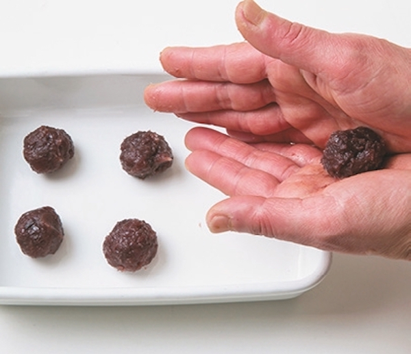 1.米粉に抹茶パウダーを加えてよく混ぜる。粒あんは5等分してそれぞれ丸めておく。