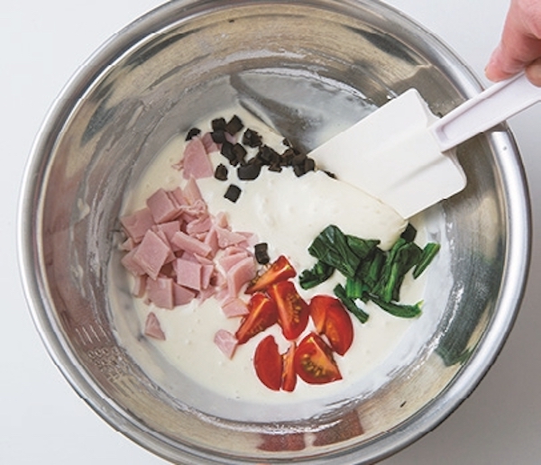 オリーブ油を加えた風味のよい生地を作り、野菜、ハム、オリーブを同時に入れて混ぜ込む。
