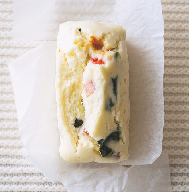 フランスのお惣菜ケーキを米粉蒸しパンにアレンジ。カラフルな具材が見え隠れし、生地に表情をつけてくれる。断面の色のコントラストは切ってからのお楽しみ。