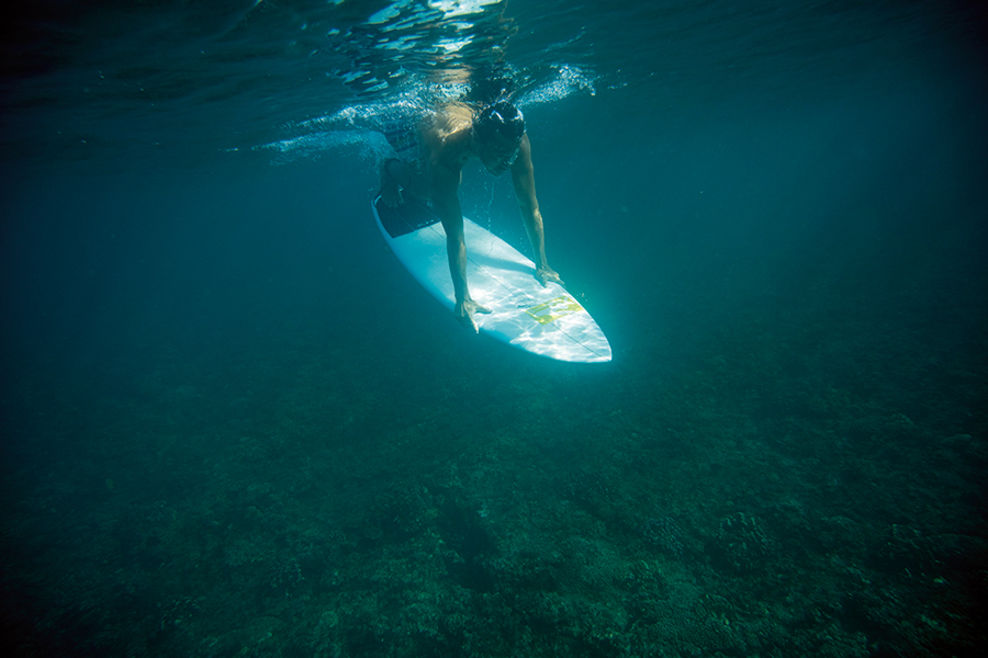 ゲッティングアウト時に迫ってくる波をやり過ごす方法はショートとロングでは異なる。ロングはボード自体が長く重いので、ショートのように自在に海中へ沈めることができないからだ。そんなロングボーダーが利用するテクニックがローリングスルーと呼ばれるもの。ボードを上下逆さまにして、サーファーもボードと同じように裏返るようにする方法だ。しかし、上手くできないと波からの衝撃をダイレクトに受けて、波と共に岸側へかなり戻されてしまう。大事なのは波に対して真っ直ぐアプローチした上で、裏返しになったときに体がボードから離れないようにするということ。肘を折り曲げて、胸をボードに近づけるようにしてボードに体を引きつけるときっと上手くいくだろう。
