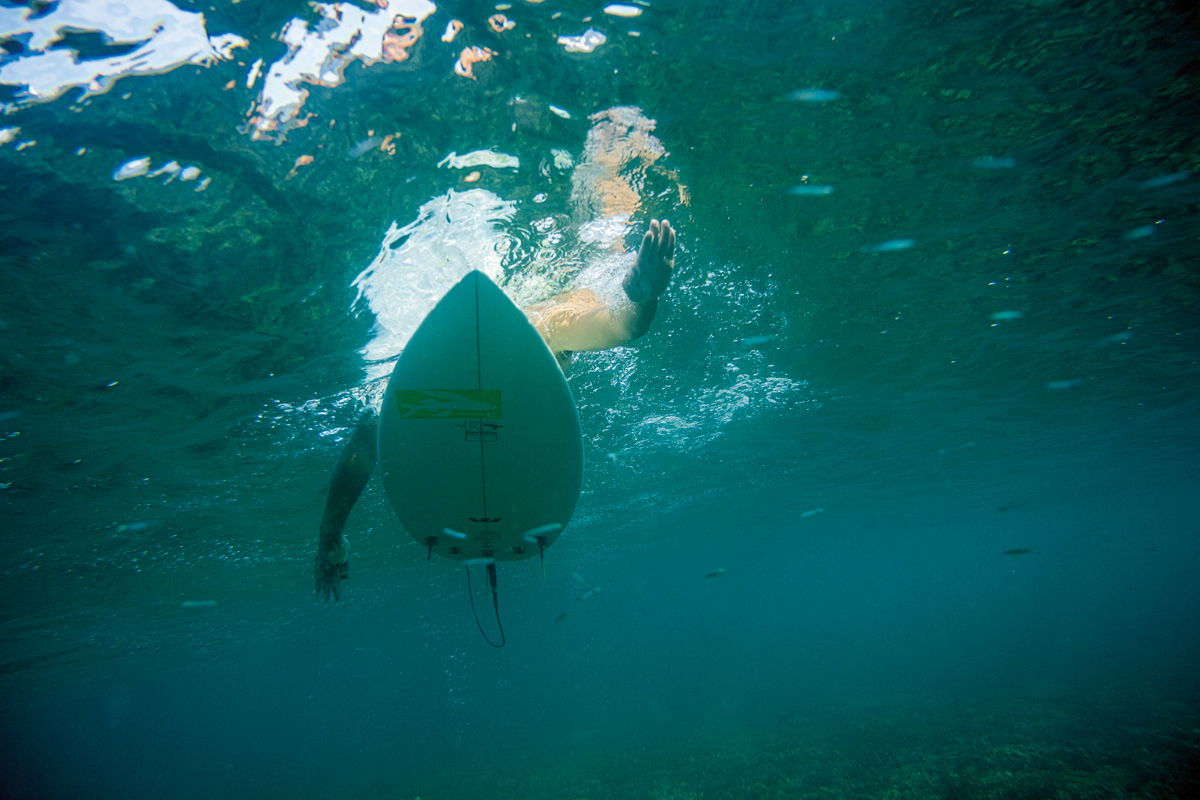 サーフボードの容量が小さく、軽く仕上げられているショートボードは、ロングボードに比べて圧倒的に取り扱いが楽だ。サーフィンの場合、ゲッティングアウトのときにやってくる波をどうやってやり過ごすのかというのも課題になるが、ショートボーダーはボードを海に沈めて波を回避するドルフィンスルーというテクニックを利用している。これは英語ではダックダイブと呼ばれるが、とにかくいかにしてボードを上手く海の中深くに沈めるかというのがキモであり、同時に自分の体も海の中に深く沈めることが重要になる。ポイントとしては、ボードを沈めるときに片方の足でボードのテールを蹴ると同時に、もう一方の足を空中に上げるようにして上半身をボードから離れないようにすることだ。