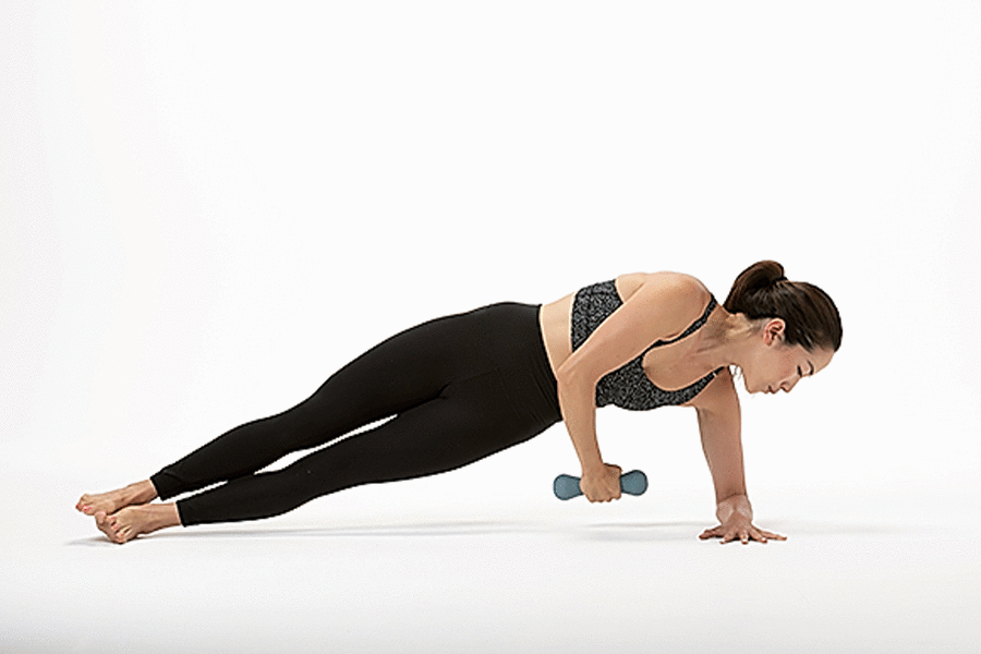 通常は手首、肘、肩が一直線になるように、腹斜筋を使って身体を伸ばすが、ダンベルを持つ場合は肘を痛める可能性があるので、腕を地面に置いたサイドプランクで行う。