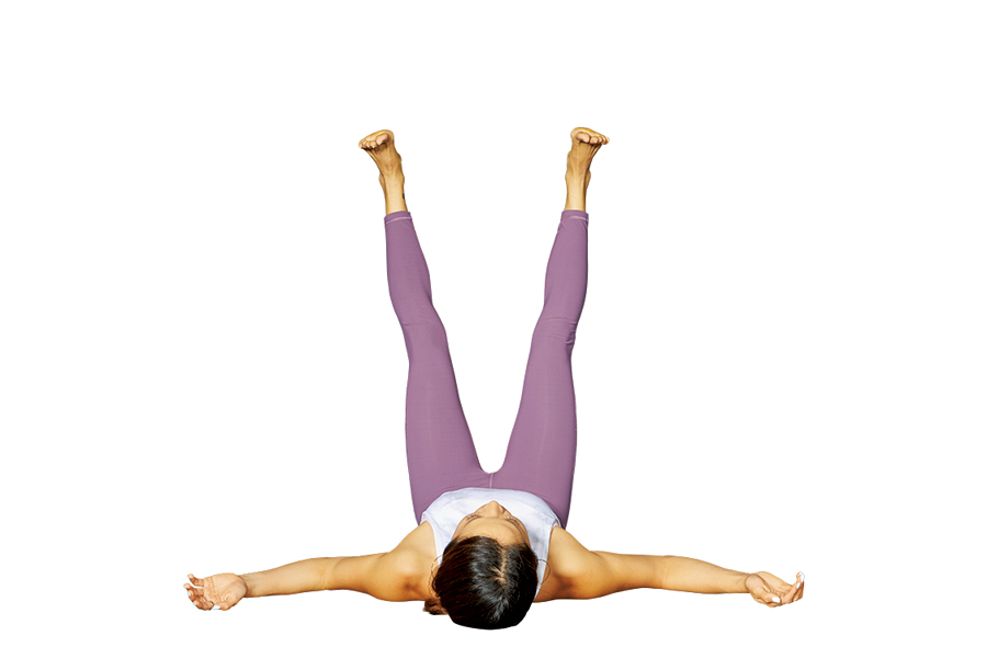 お尻を壁につけて両手を広げ、気持ちいい程度に開脚するこのポーズはリラックス効果も抜群。足の血液が心臓に戻り、副交感神経も高まる。