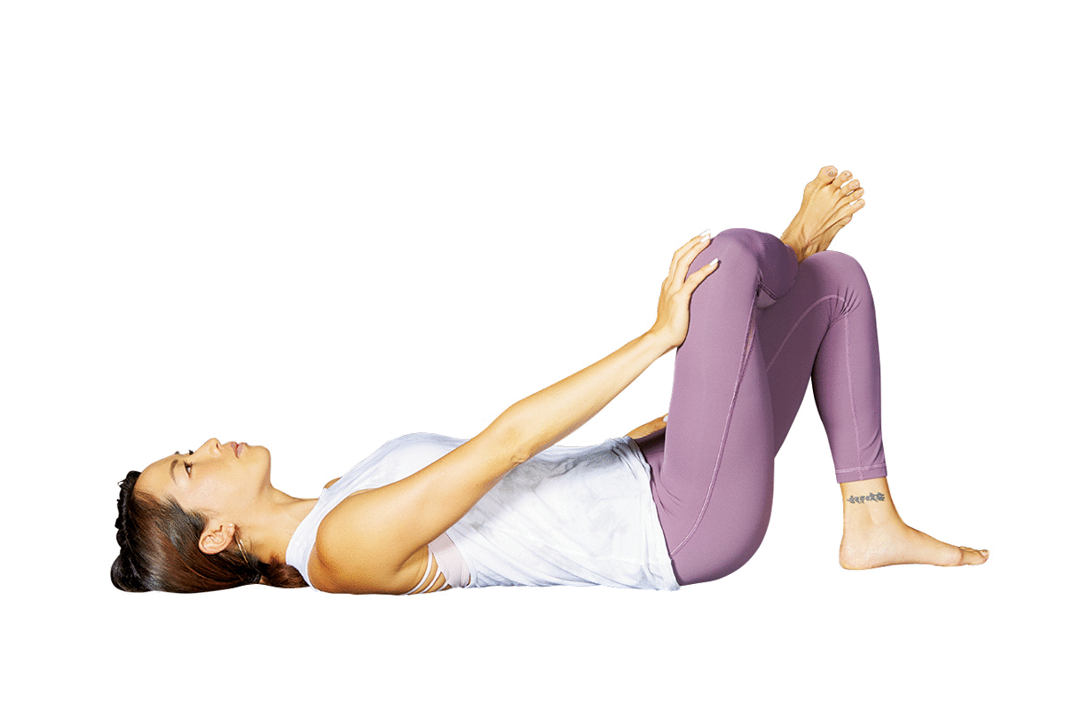 仰向けになり、両膝を立て、右足首を左の腿の上に乗せる。右手を股の間に通し、左の膝か腿の裏を両手で掴む。そして右膝は顔から離し、左足は顔に近づけていくイメージでお尻の筋肉を伸ばす。足を入れ替えて同様に行う。縮まりやすいお尻の柔軟でリラックス効果も。
