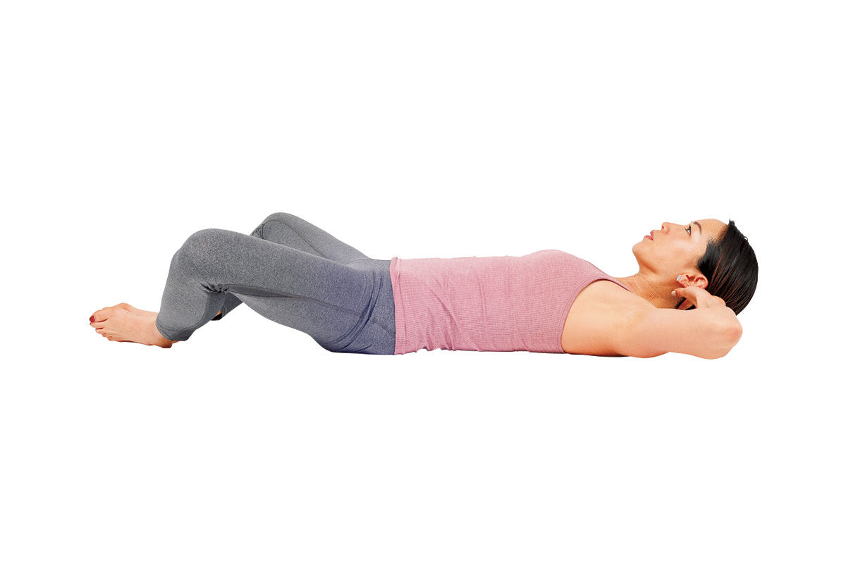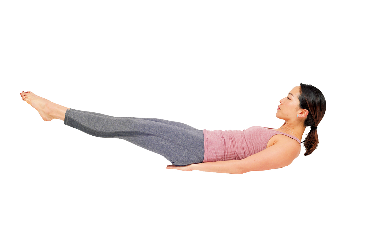 仰向けに寝て、両手をお尻の下に入れ、つま先を伸ばしたまま足を浮かせる。体幹を意識しながら、頭を上げ、つま先を見つめて10秒ホールド。呼吸は続け吐く息でお腹を閉めるよう意識する。