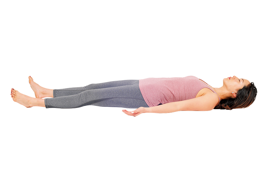仰向けになり、全身の力を抜いて、楽な姿勢になる。頭の中も空っぽにして、しばらくリラックス。心身ともに休ませよう。心が静寂に包まれるのを感じて。