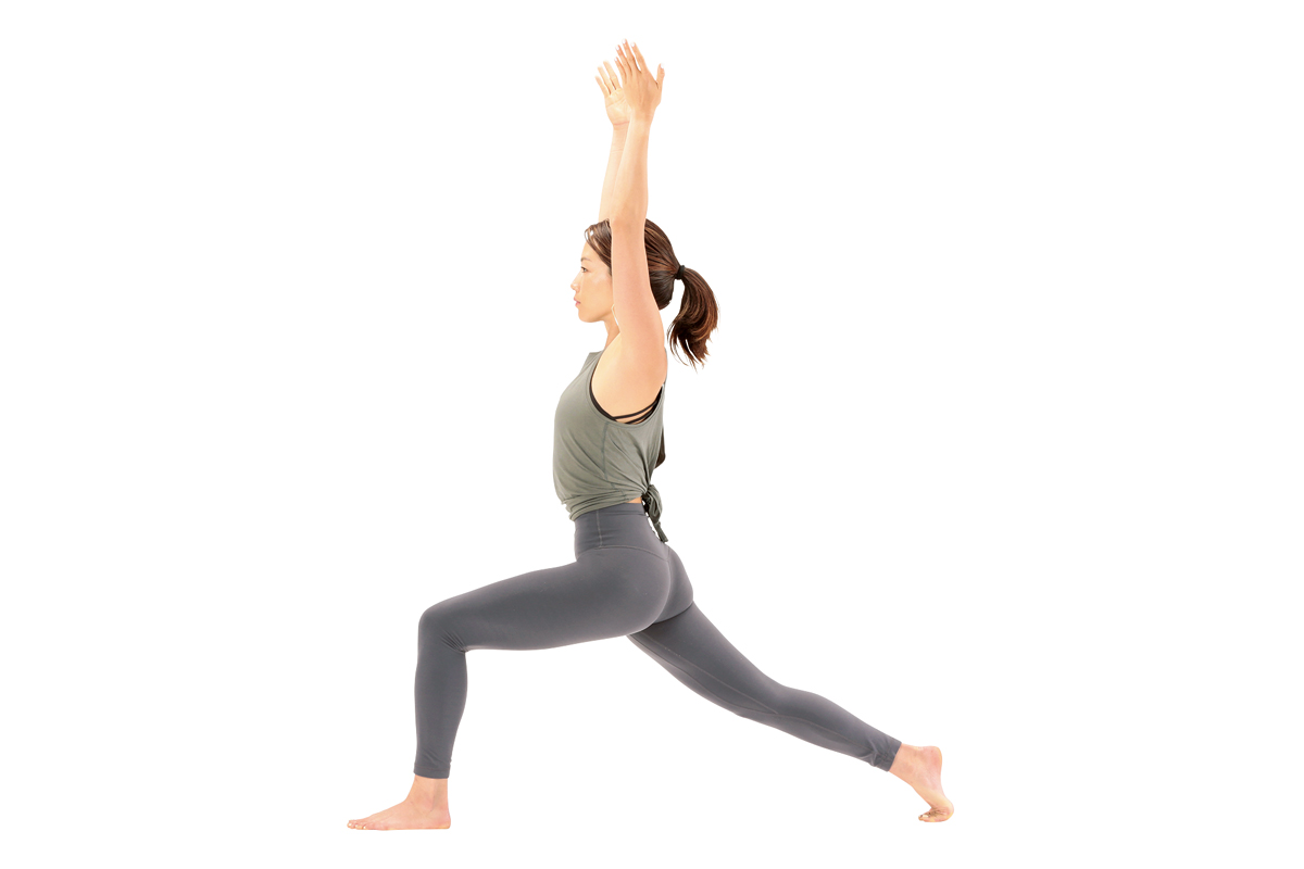 前足の膝が足首の上にくるようにし、足を前後に大きく開く。後ろ足は踵をあげ、しっかりと伸ばす。両手は耳の横を通り、天井に。肩がすくまないように気をつけよう!
