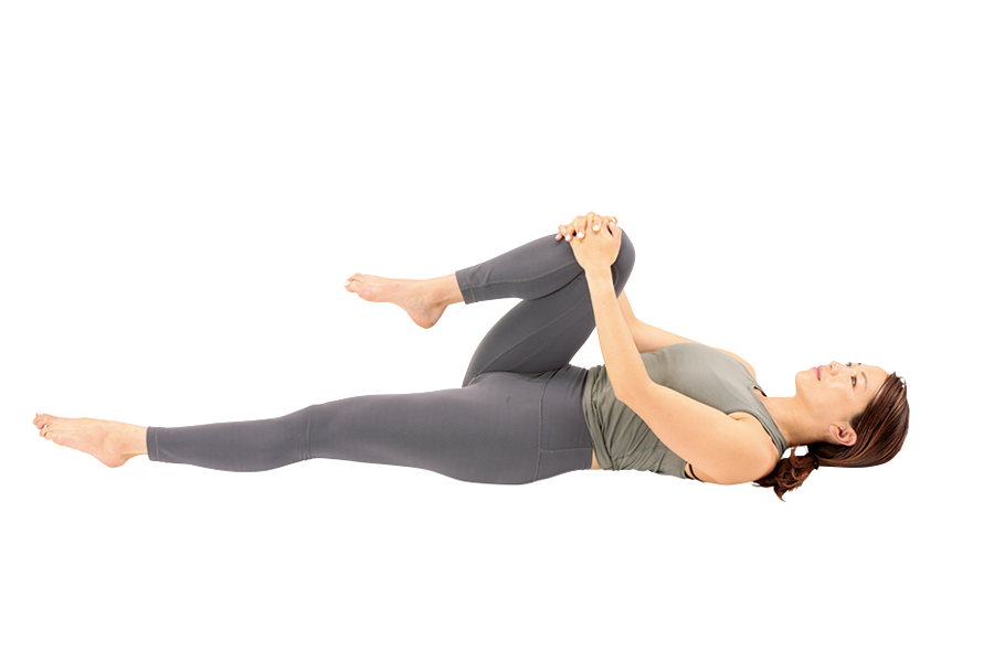 仰向けになり、膝を胸の真ん中に抱えたのち、左足だけをマットの上に伸ばす。