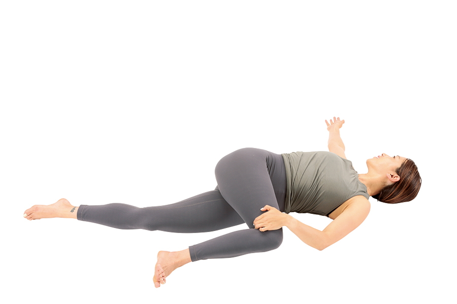 息を吸って、吐く息で右膝を体の左側に持ってくる。右膝を手で持ちながら、お尻の外側を伸ばしていく。胸も伸ばすために目線は右手へ。
