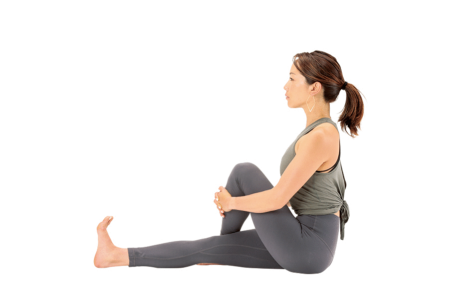 両足を伸ばして床に座り、左足を右足の腿の外側に置く。左膝を抱えて、しっかりと背筋を伸ばす。