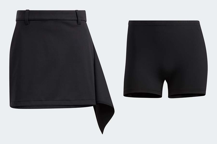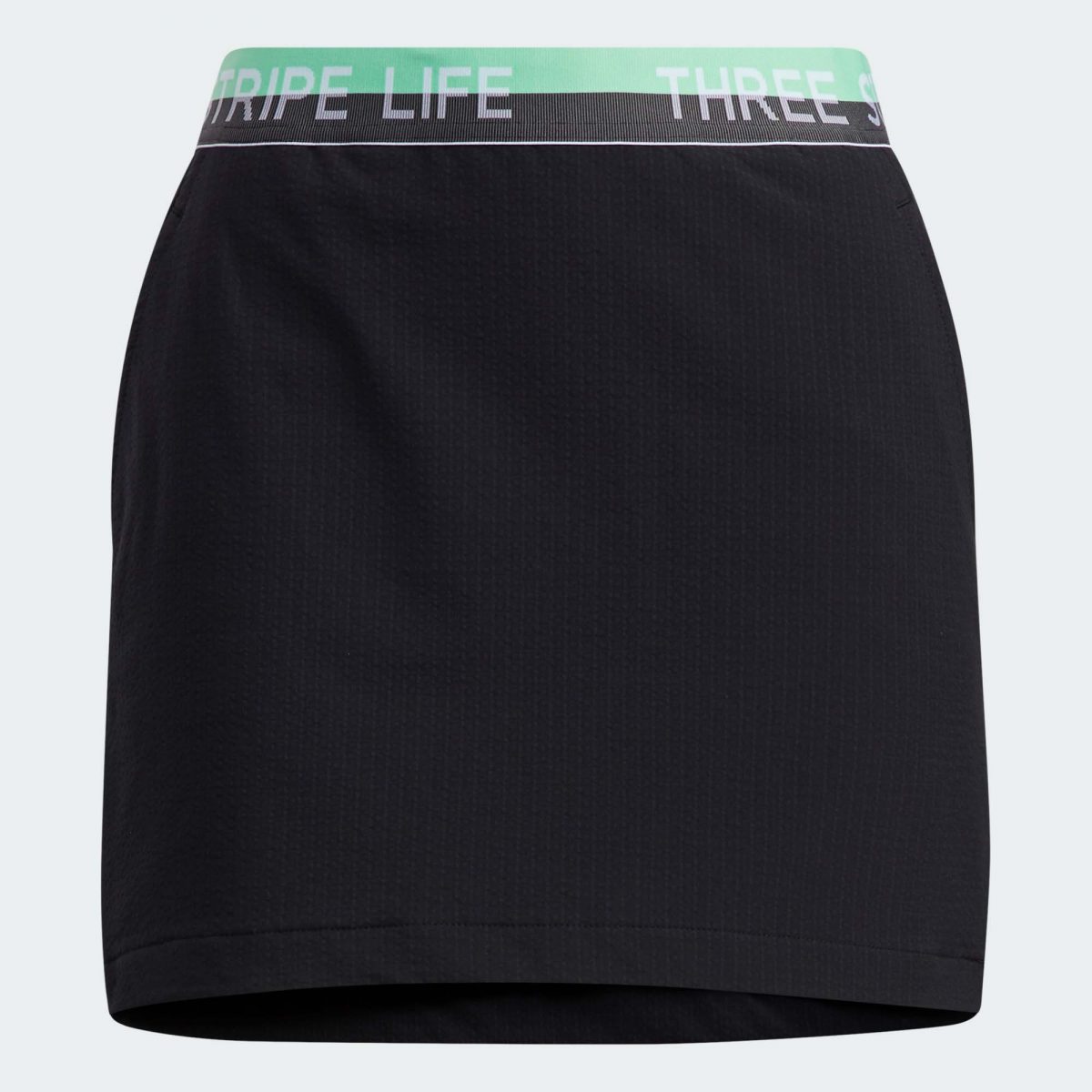 4方向への伸縮性に優れたボンディング素材のストレッチスカート。スイングの際に動きの出る後ろ身頃のスリーストライプスのディテールがポイントです。取り外しができるインナーパンツ一体型。