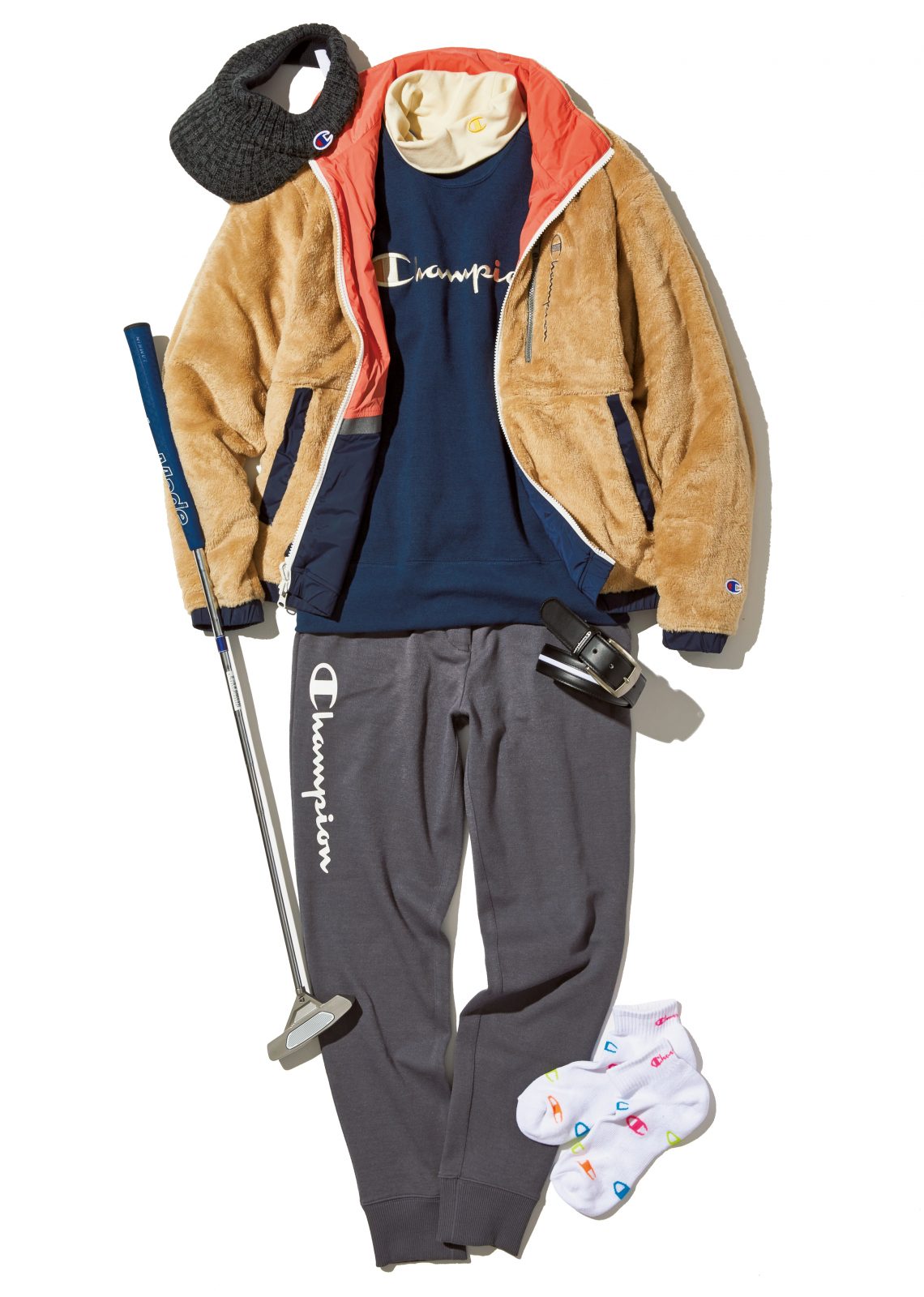 こちらのルックは、インナーにタートルネックを合わせたスウェットに、ストレッチ性の高い、ジョガーパンツの組み合わせ。素材感の違いで着こなしの幅が広がるリバーシブルジャケットもストレッチ性が高く、重ね着してもスイングを妨げません。しかも、元々が歴史あるアスレチックウエアブランドなので、抗菌・防臭機能「C ODORLESS by Polygiene ®」加工の素材やストレッチ性、保温性など、高い機能性でプレーへの集中をサポート。街着感覚でリラックスして着られるのもチャンピオンゴルフならでは。あの勝みなみ選手もお墨付きの本格派なんです。