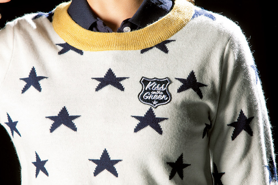 ブランドロゴワッペンをワンポイントとして胸元に。人気の星柄モチーフを全面に配したニットは、リブにイエローを効かせて楽しげなデザインに。