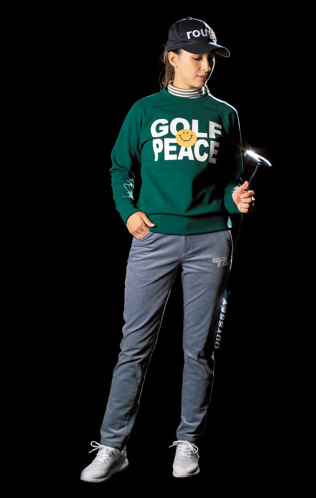 ブランド定番のダンボールニットの胸元には「GOLF PEACE」、こんな時だからこそ「ゴルフで平和な世界を!」のメッセージ……。ゴルフが上手に見え、オシャレ心も忘れない、一言でいうとそんなスタイルです。