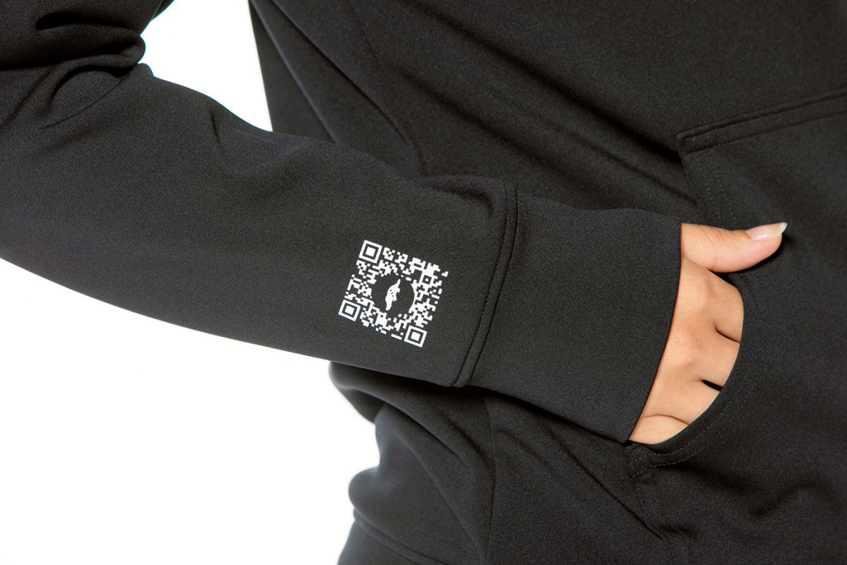 新スタイルのオフタートルスウェットの袖口には、QRコードをプリント。まだブランドを知らないお友達には、こちらをかざして、はいどうぞ!